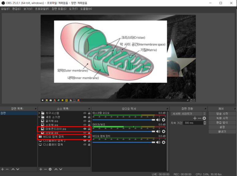 ▲ 위의 경우는 비디오 캡쳐 장치 소스이미지 소스보다 위에 있으므로, 그림 위에 내 얼굴이 표시되게 됩니다.