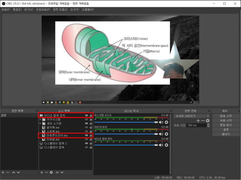 ▲ 위의 경우는 비디오 캡쳐 장치 소스가 이미지 소스보다 위에 있으므로, 그림 위에 내 얼굴이 표시되게 됩니다.