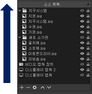 ▲ 소스목록의 소스들의 순서는 화면에 보여지는 우선 순위라고 보면 됩니다. 위쪽에 있는 소스들이 아래쪽에 있는 소스들 위에 보여지게 됩니다.
