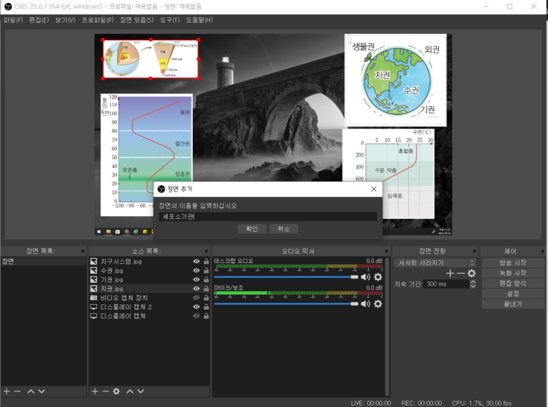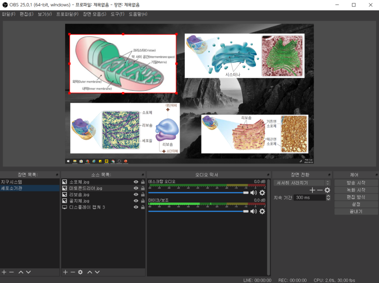 지금까지는 소스들을 추가하고 화면에 띄우는 것에 대해 설명했습니다. 이 기능들을 익히셨으면 장면 기능을 활용하여 더 효과적인 수업을 만들 수 있습니다.