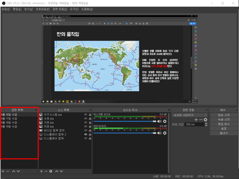 지금까지는 소스들을 추가하고 화면에 띄우는 것에 대해 설명했습니다. 이 기능들을 익히셨으면 장면 기능을 활용하여 더 효과적인 수업을 만들 수 있습니다.
