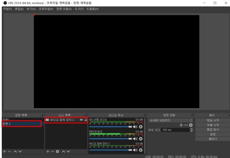 ▲ 장면2에 [비디오 캡쳐 장치2] 소스가 추가되었음에도 화면에는 아무것도 나오지 않습니다.