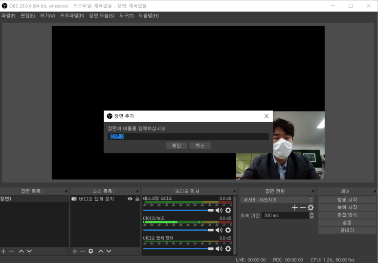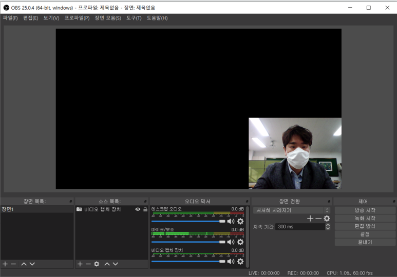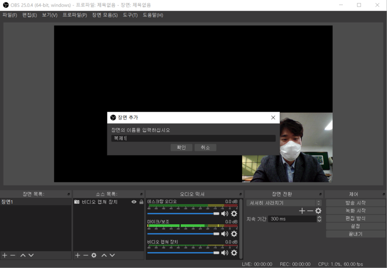 ▲ 처음 장면1에 [비디오 캡쳐 장치] 소스를 추가한 모습입니다.
