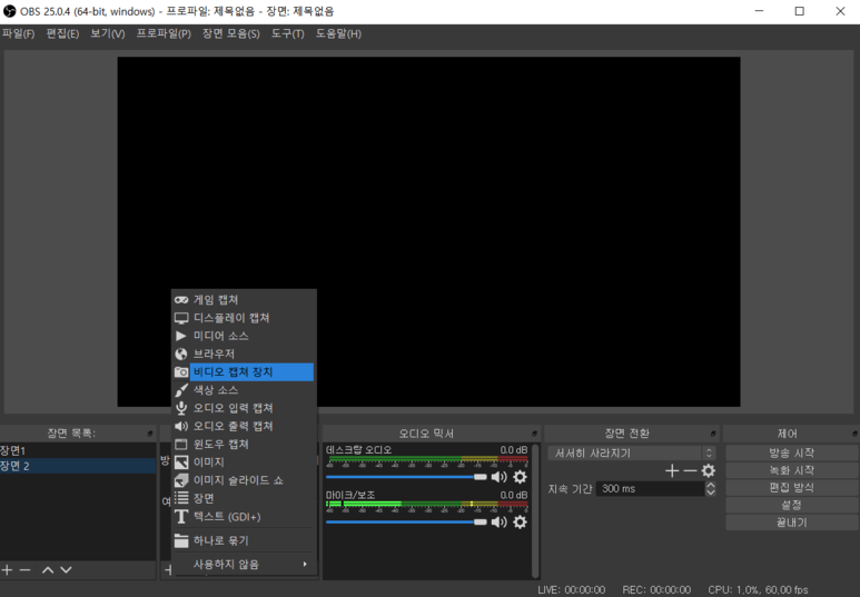 ▲ 처음 장면1에 [비디오 캡쳐 장치] 소스를 추가한 모습입니다.