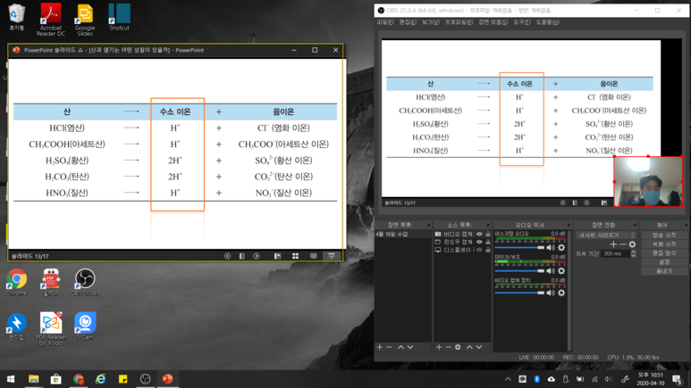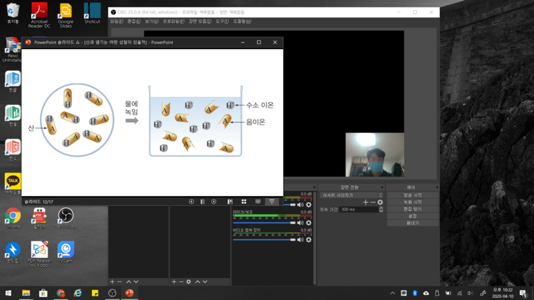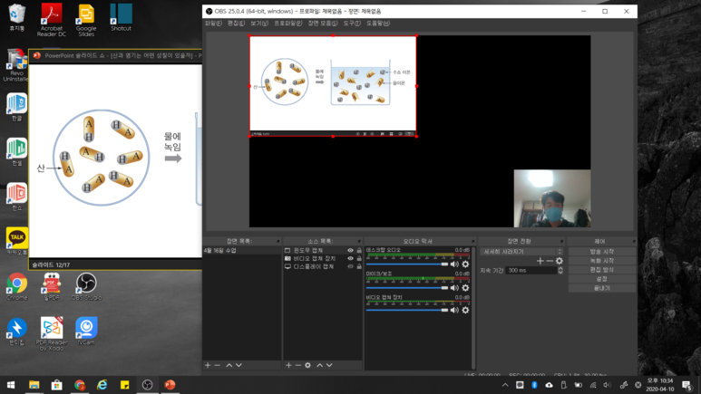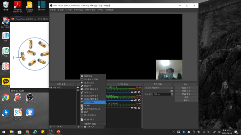 ▲ OBS studio에 내 얼굴을 띄우고 수업할 ppt를 열었습니다.