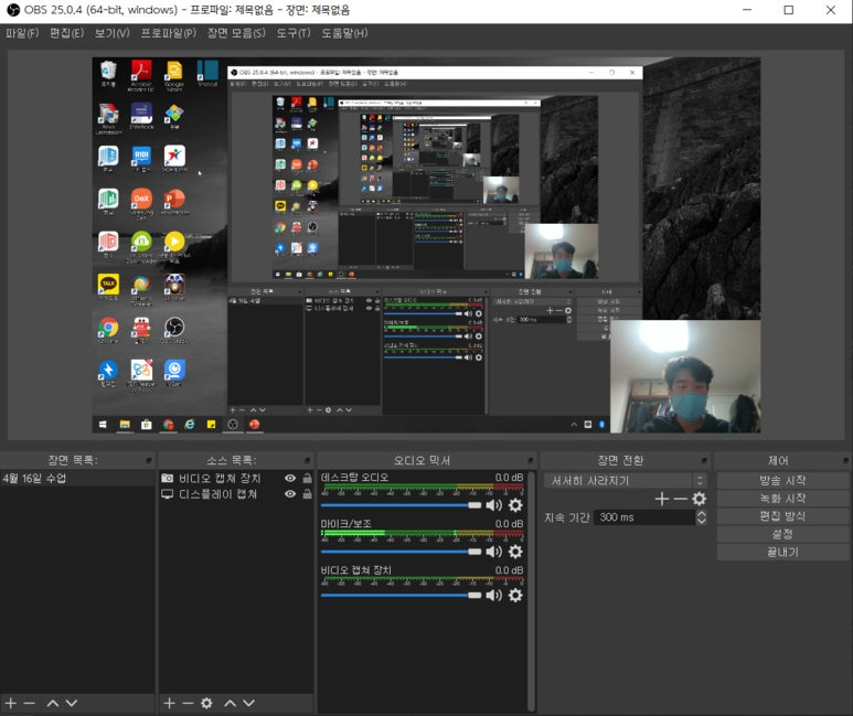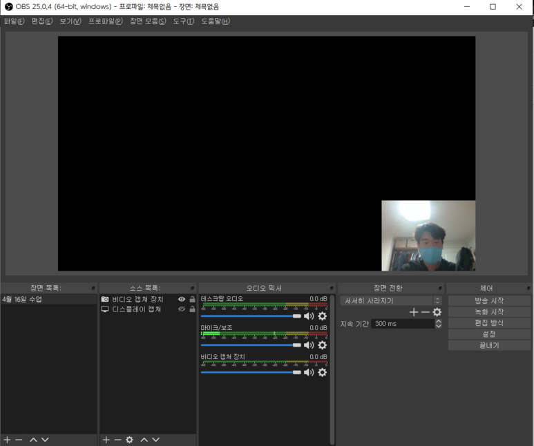 ▲ 수업 녹화를 위해 디스플레이 캡쳐와 비디오 캡쳐 장치를 소스에 추가한 모습입니다.