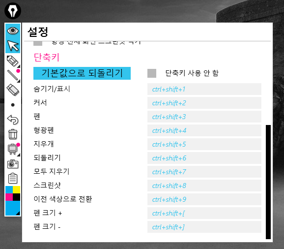 원하는 기능에 단축키를 설정할 수 있습니다.