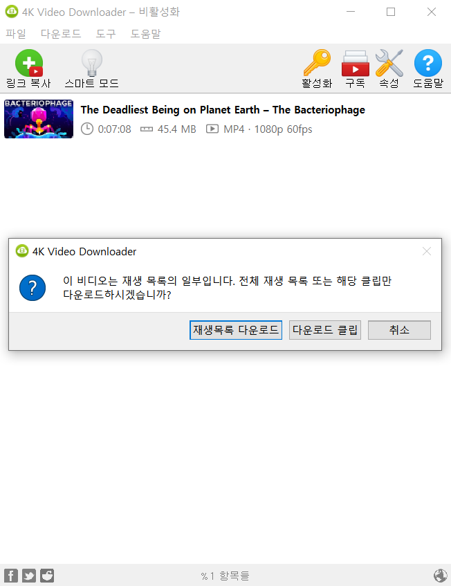 이런 창이 뜨는데 [재생목록 다운로드]를 누르면 재생목록의 전체 영상이 모두 다운로드 되고, [다운로드 클립]을 누르면 주소복사한 영상 1개만 다운됩니다.