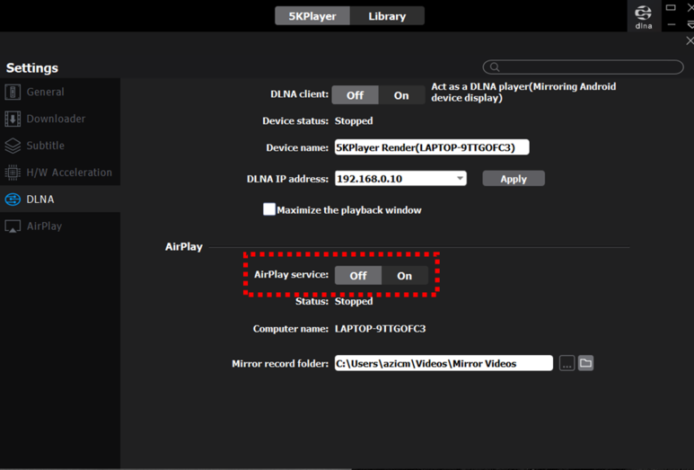 ▲ 5K player 설정으로 돌아와 AirPlay service - [ON] 선택