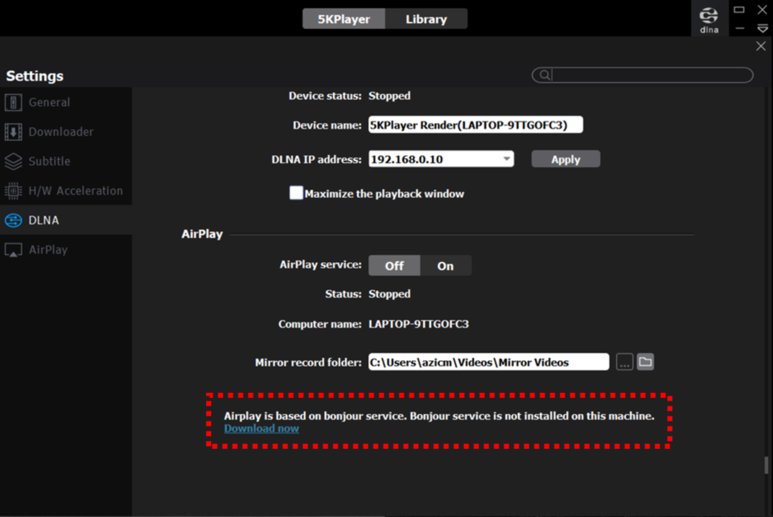 ▲ 밑으로 내리면 [AirPlay] 설정이 있습니다. 아래쪽의 [Download now]를 클릭하여 bonjour service를 다운받고 설치합니다.