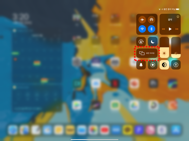▲ 아이패드 오른 쪽 위를 쓸어내리면 나오는 메뉴에서 [화면 미러링] 선택