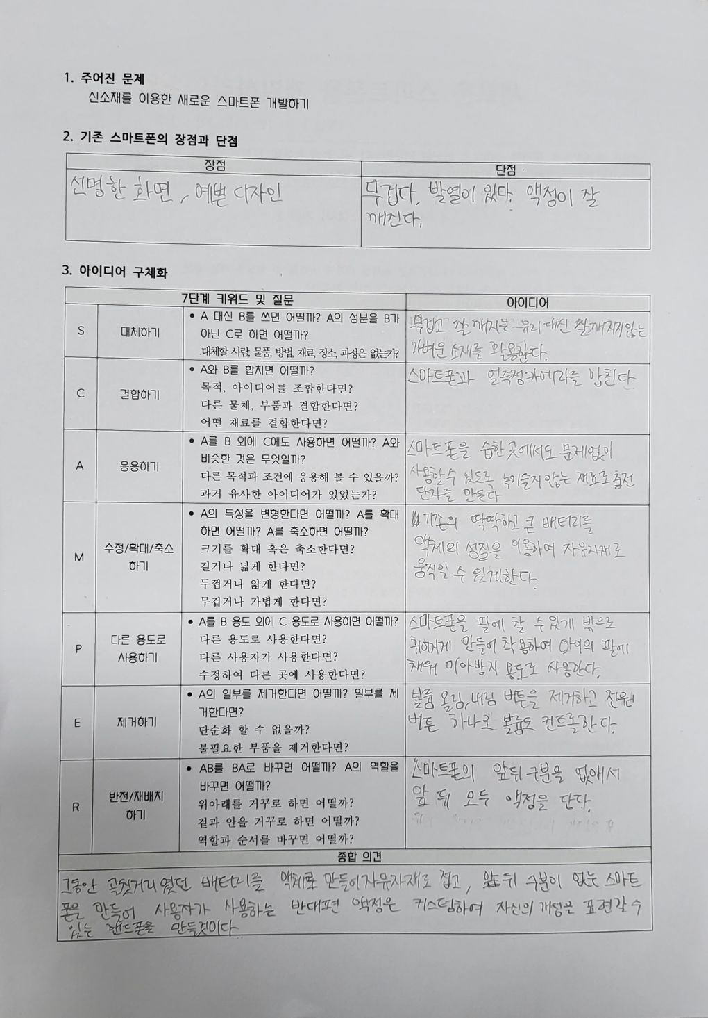 신소재라는 것이 다른 물질의 성질을 가져오거나, 기존의 성질을 변형하거나, 아예 새로운 성질을 가진 것이기 때문에 스캠퍼 기법을 활용하여 아이들이 아이디어를 도출하면 좋겠다 생각했다.