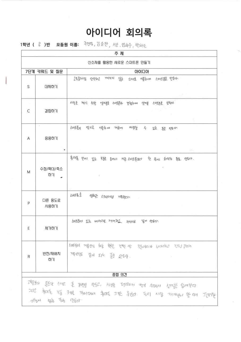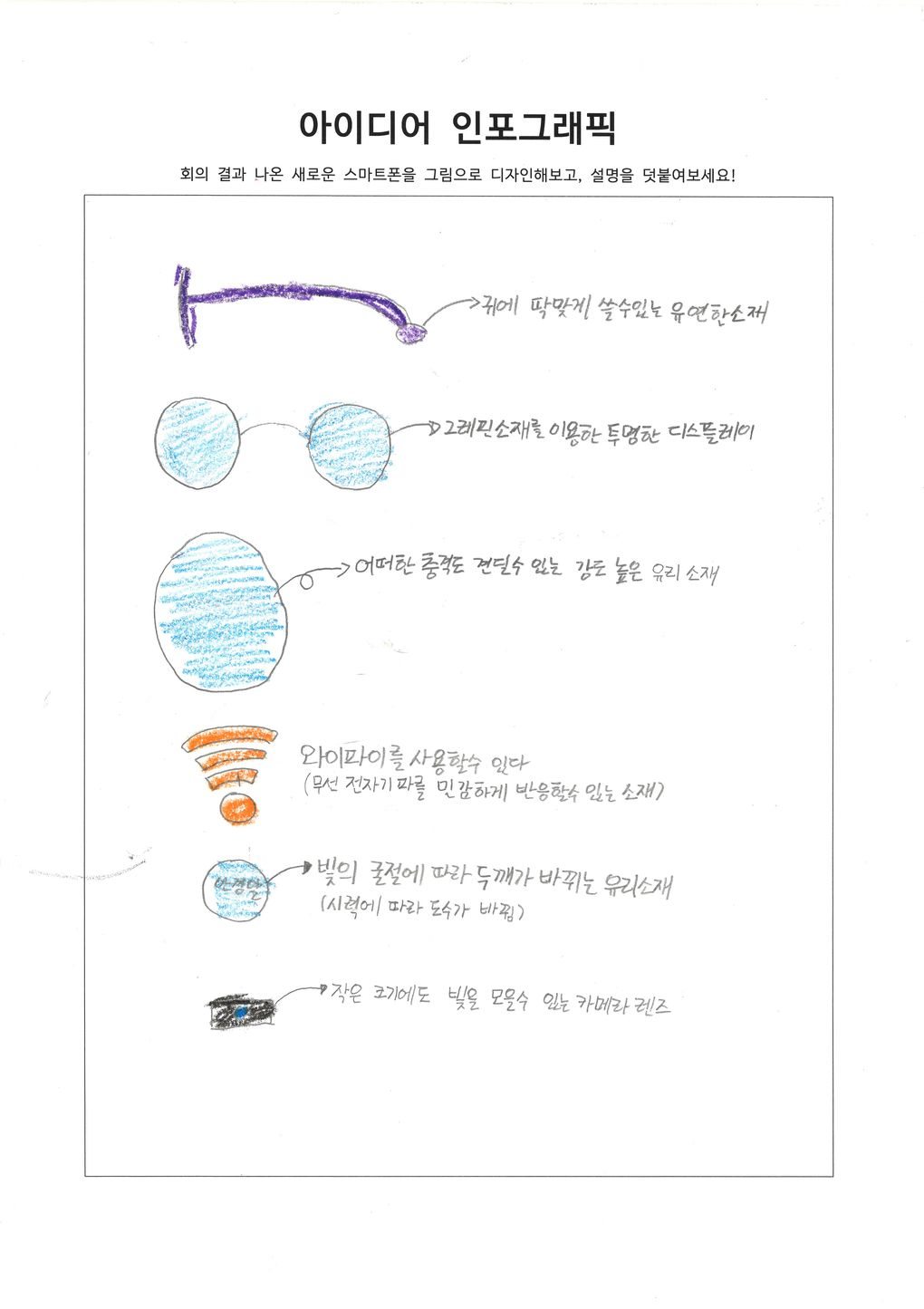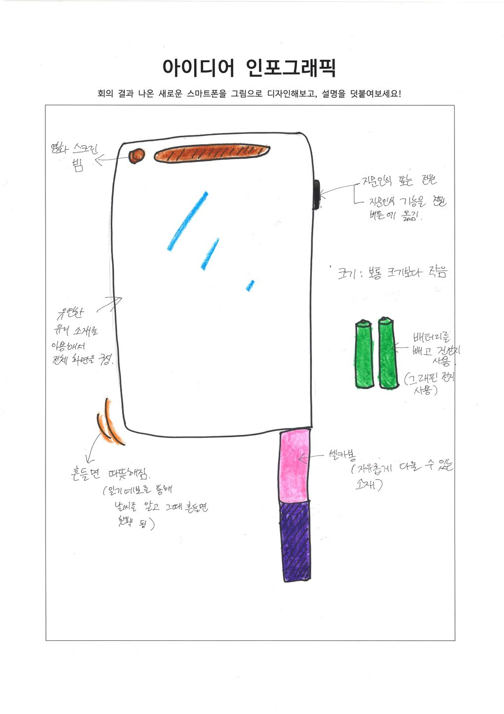 주제를 무엇으로 할까 고민하다가 아이들에게 가장 친숙하고 다양한 소재가 이용되는 ‘스마트폰’으로 정했다. 개인별로 신소재와 그것이 스마트폰 어디에 활용될 수 있는지 구상하여 활동지에 작성하게 하였다.