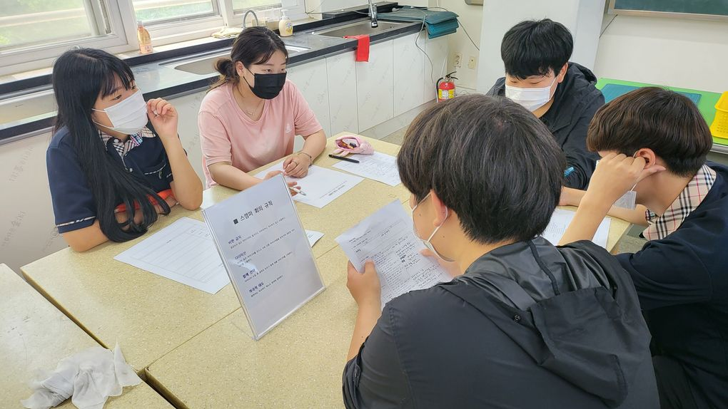 개인별로 아이디어 구상이 끝나면 모둠별로 토의를 통해 각자 생각한 아이디어를 공유한다. 토의 전에 간단한 규칙을 설명해주고, 다양한 의견을 수용하여 좋은 아이디어를 함께 만들어내는 것이 토의의 목적임을 설명해준다.