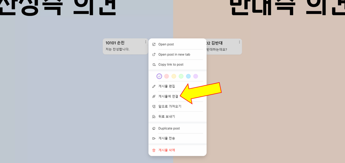 5. 게시물의 색깔도 바꿔주면 찬성과 반대 의견을 구분하기 쉽다.