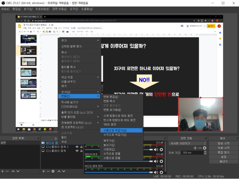 ▲ 소스목록의 [비디오 캡쳐 장치]를 우클릭한 뒤, [변환] - [수평으로 뒤집기]를 선택하시면 됩니다.