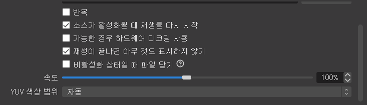 ② 소스가 활성화될 때 재생을 다시 시작: (체크 시) 영상을 띄웠다가 숨기고, 다시 띄웠을 때 처음부터 영상이 재생됩니다.