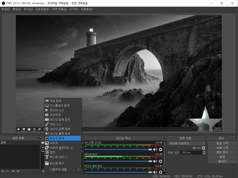 ▲ 이제 OBS studio로 돌아가 소스 목록의 [+] - [윈도우 캡쳐] 선택