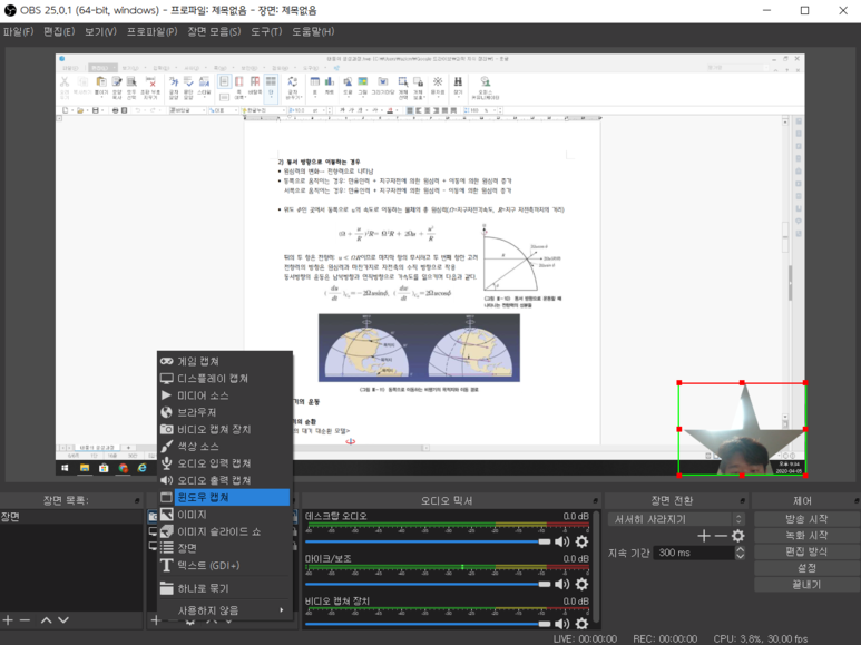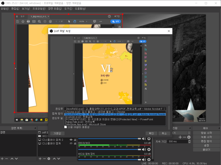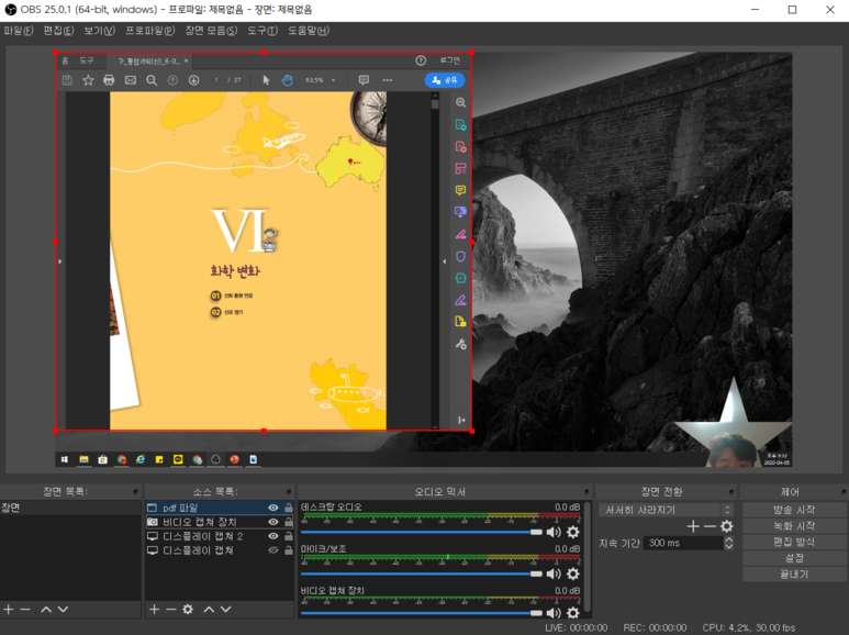 사실 이것도 pdf 창을 그대로 컴퓨터 화면 녹화를 통해 보여주어도 되지만, 창 모드 소스를 이용하면 더 깔끔하게 보여줄 수 있습니다.